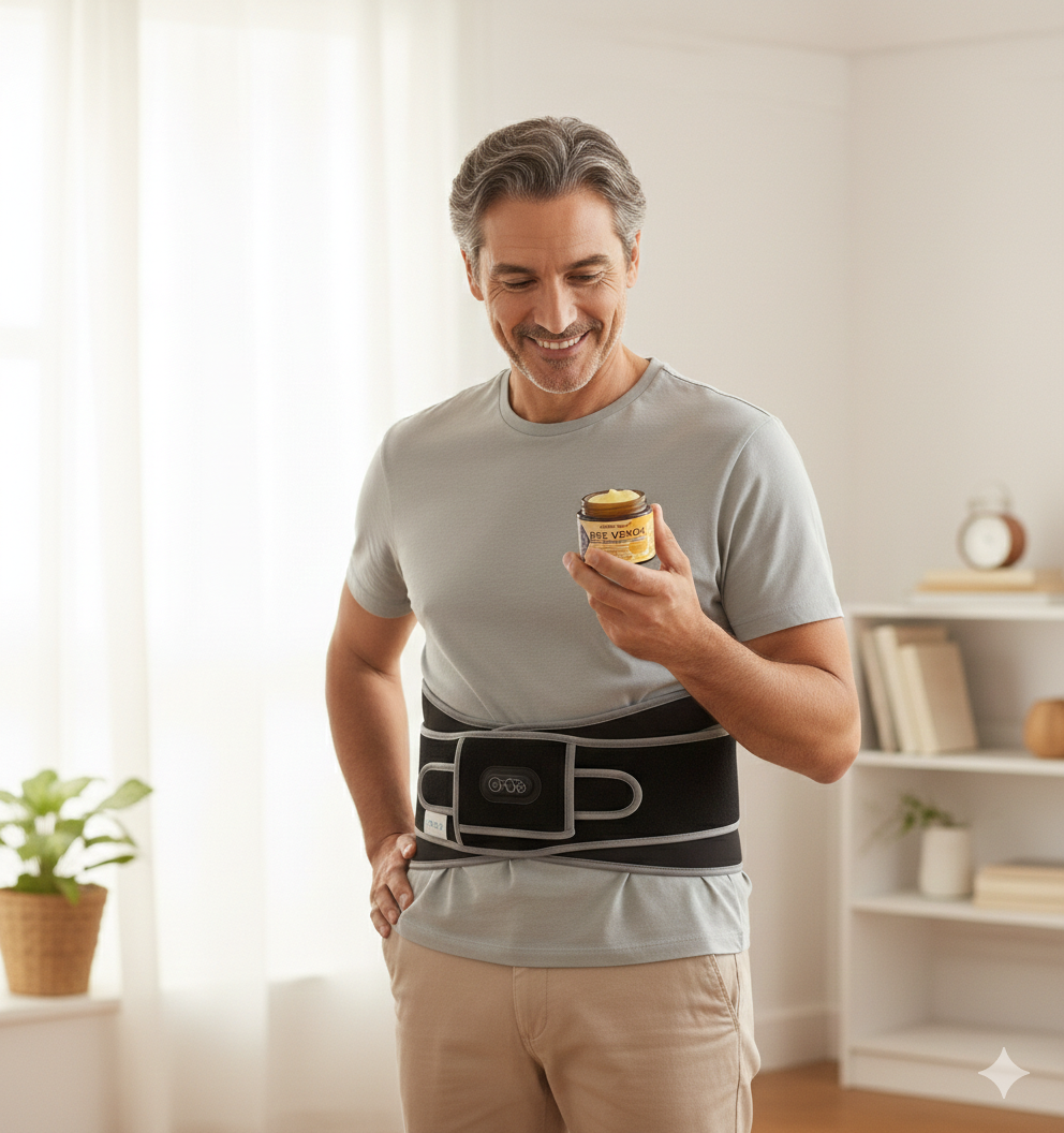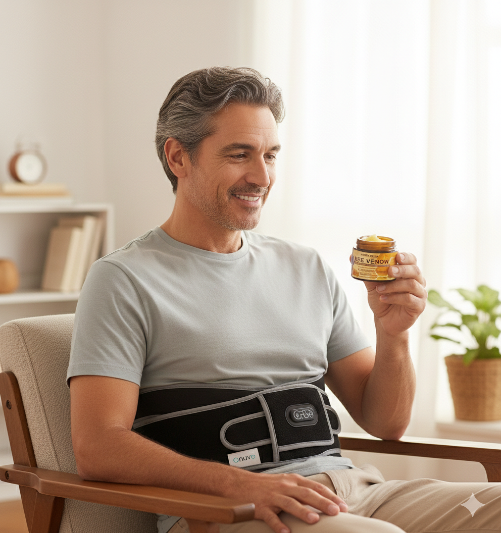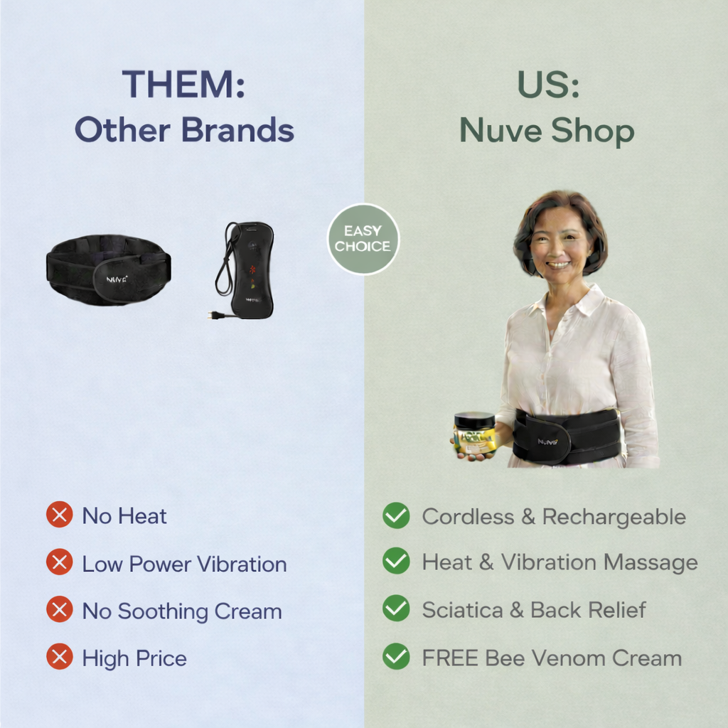 Slip on the Nuve Back Support Massager, apply the Nuve Soothing Cream, and enjoy gentle warmth, light compression, and rhythmic vibration designed to help you relax and feel more comfortable.